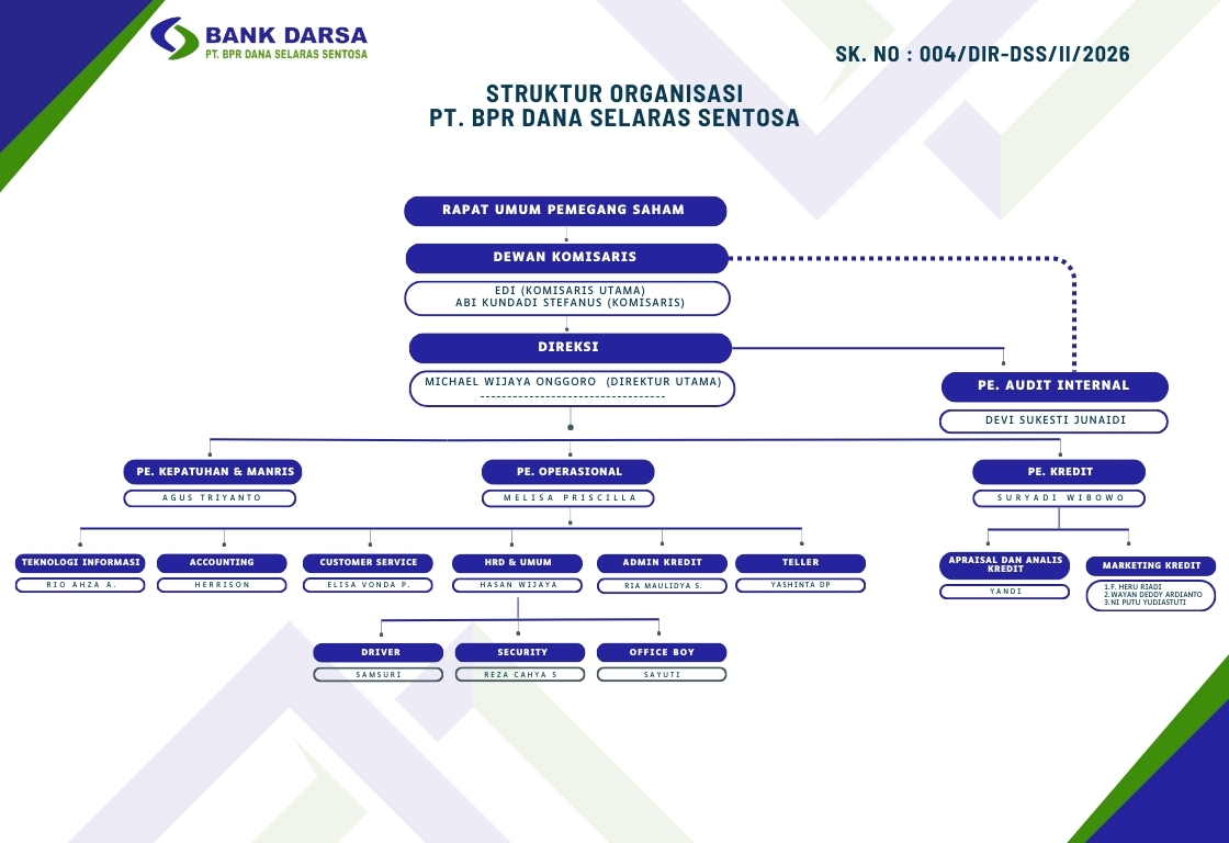 Bank Darsa dijalankan oleh jajaran pengurus berpengalaman dan pemegang saham yang memiliki komitmen kuat untuk mendukung pertumbuhan perbankan daerah yang sehat, aman, dan berkelanjutan.